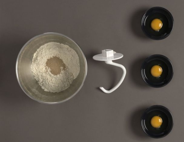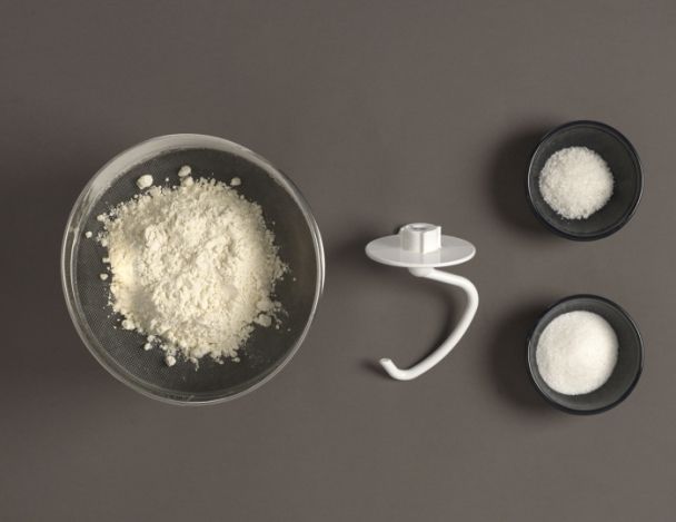 FacileTamiser la farine et la verser dans la cuve d’un batteur/mélangeur munit d’un crochet.
