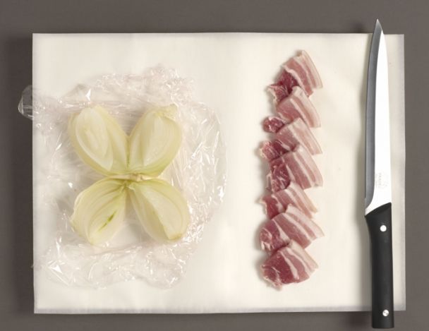 Détailler les tranches de lard en losanges, puis éplucher l’oignon tiède et détacher les pétales en le taillant en 4.