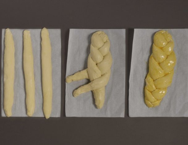 Souder les extrémités des 3 boudins et former une tresse. Souder la fin de la tresse. Dorer à l'oeuf battu et laisser reposer au minimum 1h pour que la pâte lève bien. Vous pouvez placer la tresse dans une barquette en aluminium, dans ce cas ne pas oublier de bien beurrer et fariner la barquette. Sinon placer la tresse sur une plaque de cuisson avec un papier sulfurisé.