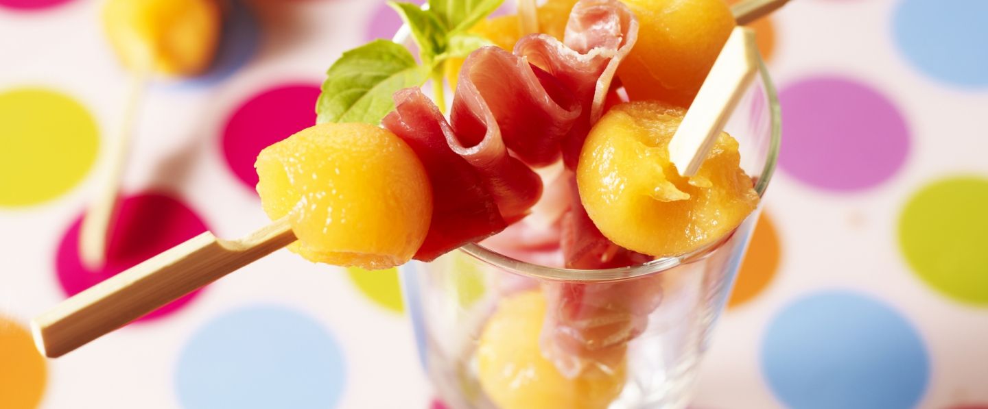 Couper les tranches de jambon en deux. Enfiler sur de petites piques en bois des billes de melon égouttées, alterner avec le jambon replié en accordéon.