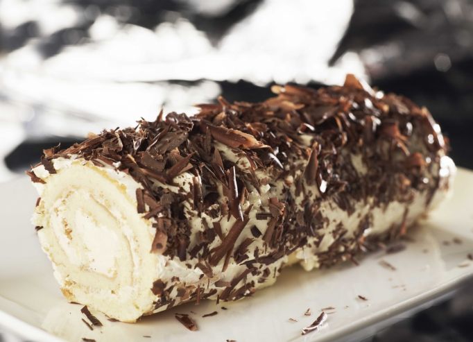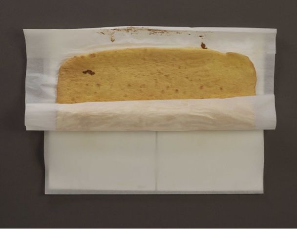 A la sortie du four, faire glisser le biscuit sur le plan de travail. Le rouler chaud dans son papier et le laisser refroidir.