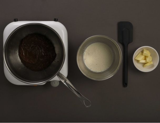 Faire bouillir la crème avec le gingembre poudre. Faire fondre les chocolats cassés en morceaux au bain marie à température douce. Retirer du bain marie et verser dessus la crème liquide bouillante en 3 fois puis ajouter le beurre. Mélanger pour obtenir une ganache lisse. Laisser refroidir avant de réfrigérer pendant 1h. Puis la mixer pour l'alléger.