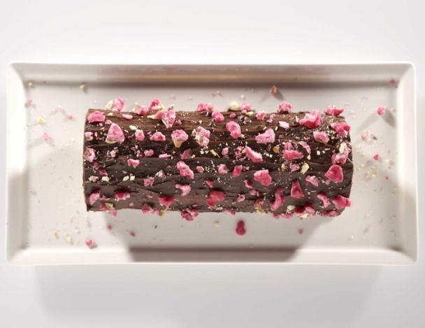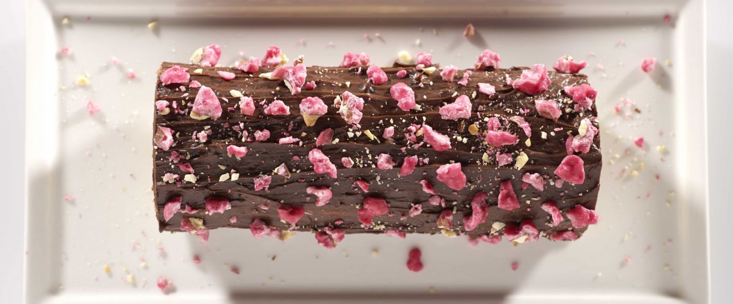 Ôter le film, puis recouvrir toute la surface de la bûche du reste de ganache. Couper net chaque extrémité. Parsemer de pralines restantes. Réfrigérer jusqu'au moment de servir. (2h minimum ou jusqu'au lendemain).