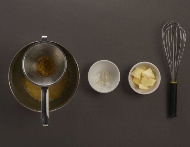 Débarrasser dans un bol en passant au chinois puis ajouter la gélatine essorée. Laisser tiédir puis incorporer le beurre en petits morceaux. Fouetter au fouet électrique. Placer au réfrigérateur 3 h.