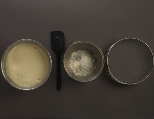 Fouetter les ceufs et le sucre 10 min à grande vitesse ; le mélange doit devenir mousseux et très aéré. Ajouter la farine tamisée petit à petit à la spatule tout en soulevant le mélange. Verser sur une plaque à pâtisserie recouverte de papier cuisson. Cuire 10 à 12 min.
