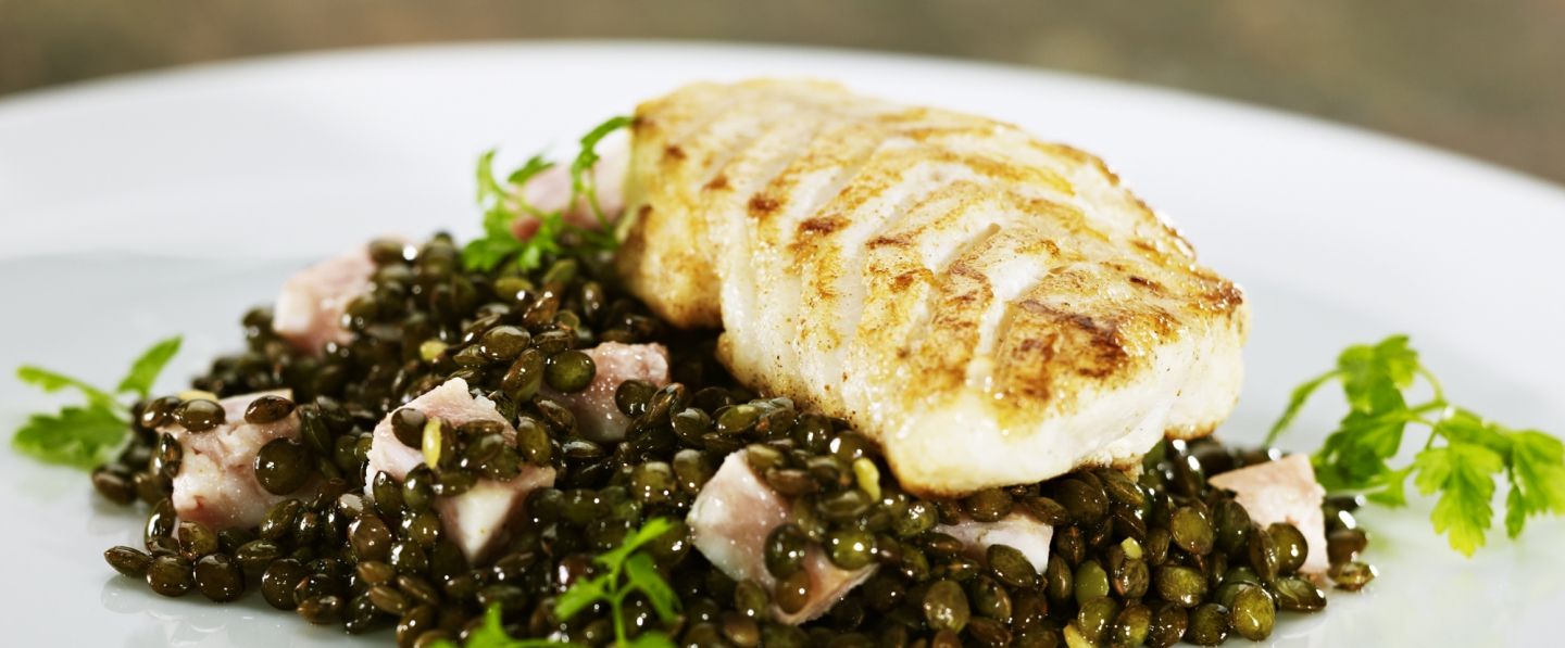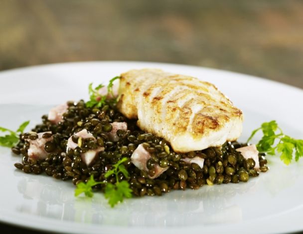 Ce délicieux poisson blanc à chair fine est rissolé, puis accompagné de lentilles vertes aux petits cubes de Morteau fumé. Une association de saveurs qui séduira tous vos convives