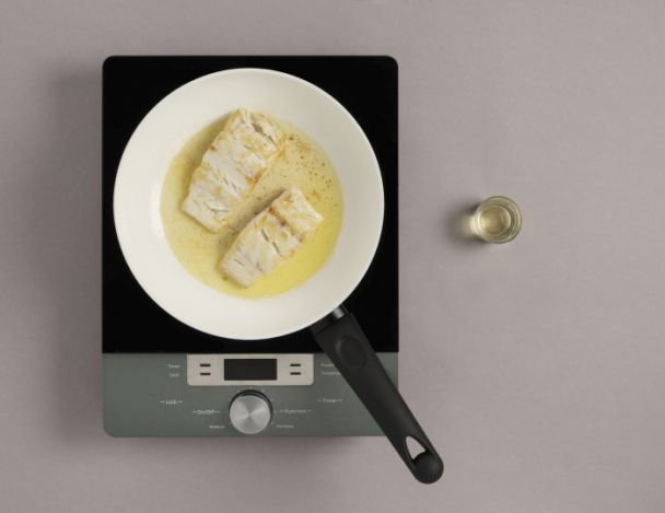 Assaisonner et cuire le cabillaud dans une poêle légèrement beurrée, un filet d’huile d’olive jusqu’à bonne coloration et retourner pour finir la cuisson.