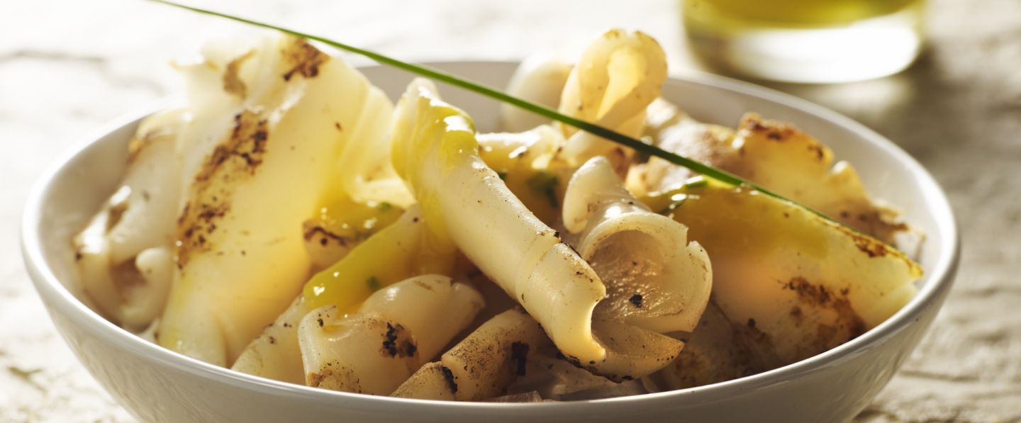 FacileCouper le blanc de calmar en carrés de 10x10 cm. Inciser légèrement la chair sur une face avec la pointe d'un couteau. Presser 3 citrons verts. Verser le jus dans un plat creux avec l'ail, saler et poivrer généreusement. Mettre les blancs de calmar à mariner 30 min au réfrigérateur.