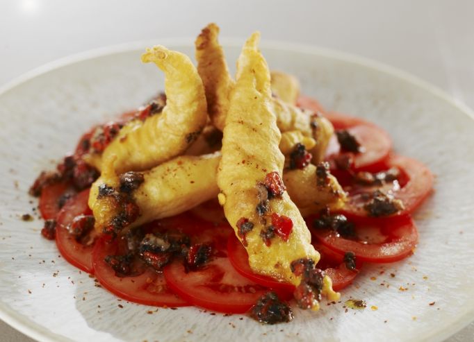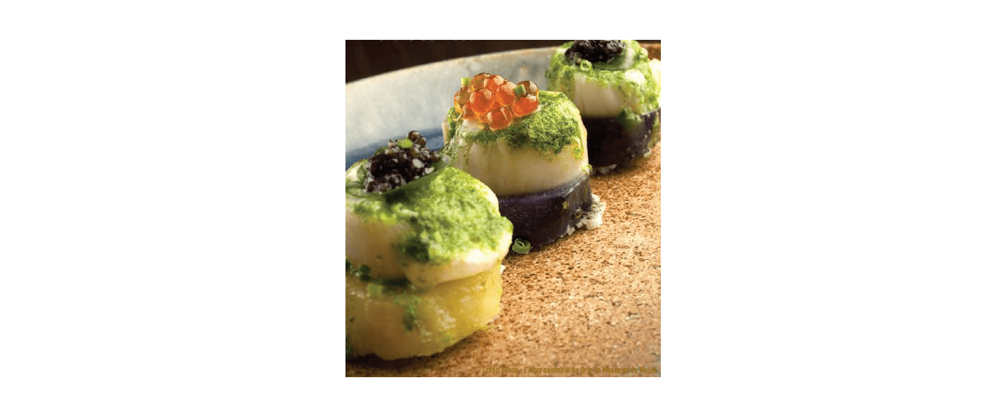 Laissez cuire pendant trois minutes. Retirez-les et dressez dans une assiette : posez du caviar ou des oeufs de saumon, arrosez de crème de Brie aux épinards, enfin versez une goutte de jus de yuzu sur les canapés.
