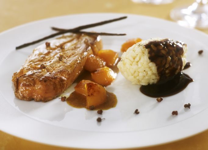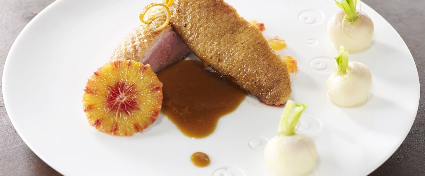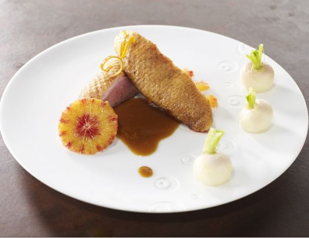 Découper les filets de canettes en fines aiguillettes. Napper de sauce et décorer avec une rondelle d'orange et des zestes confits à l'aigre-doux.