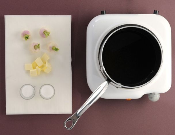 Couper en cubes les navets. Les faire cuire dans un peu d'eau, de beurre, de sel et de sucre en les surveillant régulièrement et en rajoutant un peu d'eau si nécessaire. En fin de cuisson, laisser caraméliser.