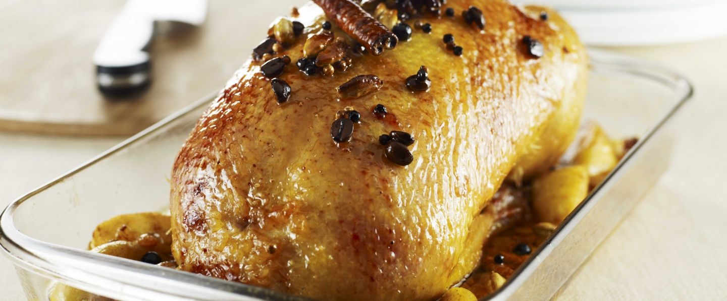 Servir les pommes avec les raisins et les noix autour de la canette rôtie, la sauce à part.