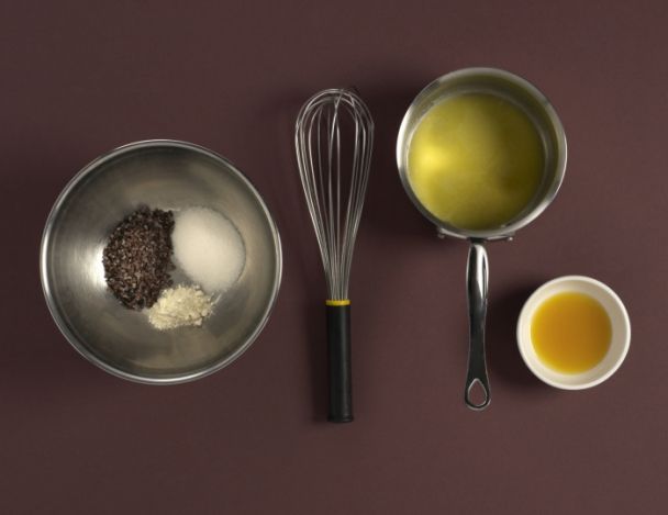 faire fondre le beurre et laisser refroidir. Mélanger le sucre semoule, la farine, le Grué de cacao (fèves de cacao concassées et grillées), ajouter 20 g de jus d’orange pressé et le beurre refroidi. Laisser durcir cette préparation au froid.