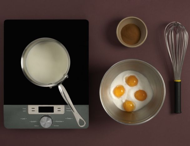 Blanchir 6 jaunes d’œufs avec 150g de sucre, verser le lait chaud dessus et fouetter vivement.