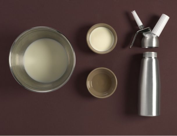 Verser dans le siphon l’ensemble pour donner une mousse de lait au moment de dresser.