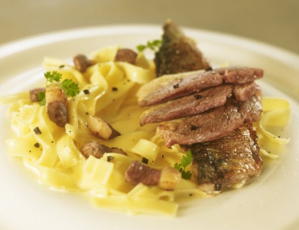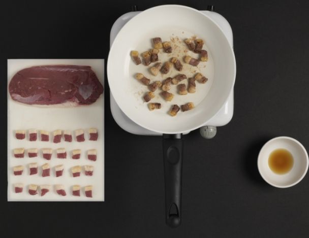 Emincer le magret en lardons de 3 à 4mm et le colorer dans un poêle chaude. Déglacer avec le jus de truffe (facultatif) et réserver.