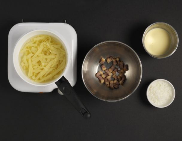 Faire cuire les pâtes à l'eau salée 3 à 4 minutes selon les indications portées sur le paquet. Les égoutter et les verser sur les lardons. Ajouter le mélange crème et œufs, puis le parmesan. Ajouter le jus de truffe (facultatif). Mélanger.