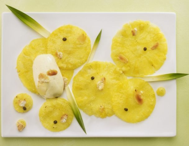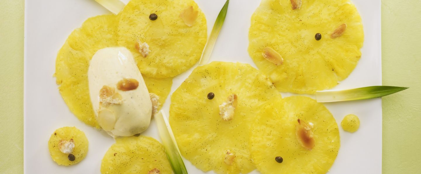 Le chef Fayet nous réveille les sens avec l’ananas, ce fruit acidulée et sucré, le limoncello, digestif italien à base de citron, et la douceur de cette quenelle de glace vanille