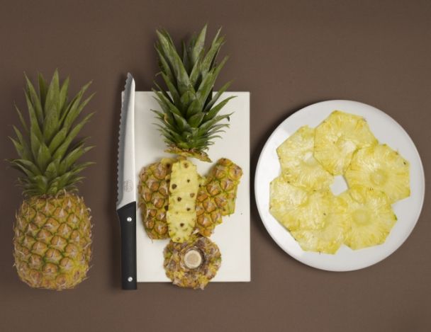 FacilePeler l'ananas au couteau scie. Découper en tranches fines. 6 par assiettes soit 24 tranches. Disposer en rond dans les assiettes. Réserver au réfrigérateur.