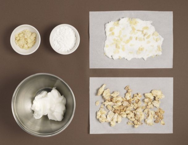 Monter les blancs en neige. Disposer sur une plaque. Mélanger les amandes avec les blancs, saupoudrer de sucre glace et cuire à 180° jusqu'à coloration. Mélanger pendant la cuisson. Réserver