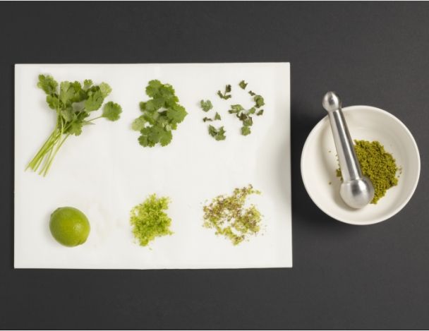 Râper le vert du citron vert et faire sécher au four à 80°/100°C. Puis le réduire en poudre avec de la coriandre à l'aide d'un mortier.