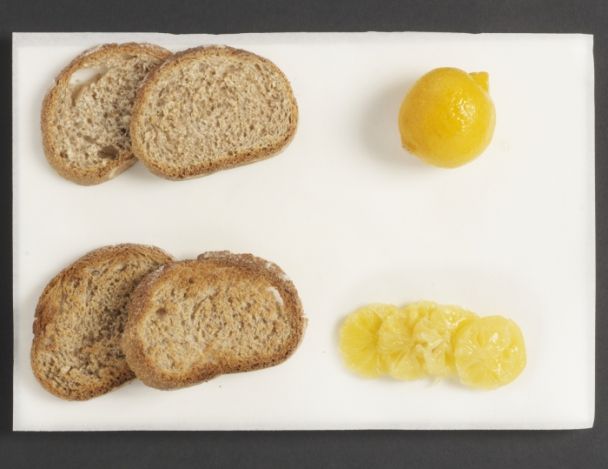 Détailler un citron jaune confit à l'emporte pièce. Couper le zeste avec son jus et un peu de sucre.