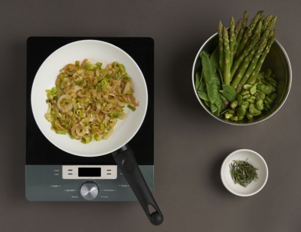 Faire suer les oignons, l'ail, le poireau avec un peu d'huile d'olive. Ajouter les fèves, les pois gourmands et les asperges. Laisser mijoter avec le romarin pendant 5 à 8 minutes à couvert puis à découvert