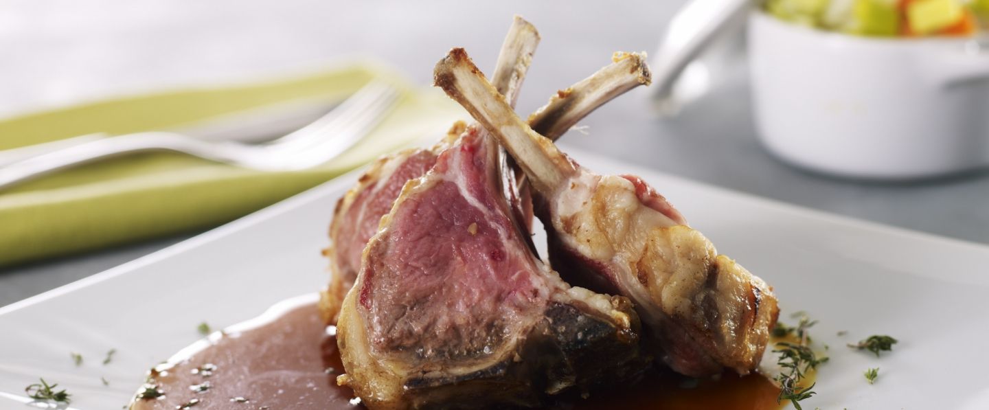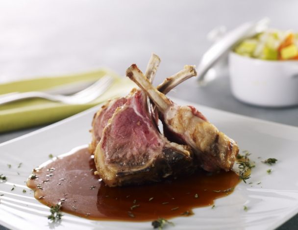 Parer l'agneau en enlevant les bords secs sur le carré. Couper des petites côtes (5 par personne) et les mettre "à cheval" en cercle sur une assiette. Chauffer sous la salamandre, napper la viande avec la sauce et mettre un bouquet de thym en décoration.