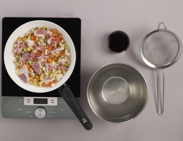 Faire un fond d'agneau. Saisir les parures d'agneau ensemble avec l'oignon, le poireau et la carotte coupée en dés. Laisser bien colorer et déglacer au vin rouge. Mouiller avec 2L d'eau et faire frémir pendant 2 heures, puis passer au chinois fin.