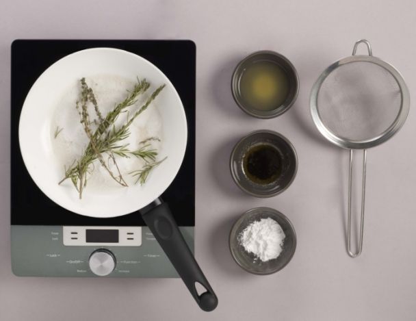 Mettre 2 cuillères à soupe de sucre et 3 tiges de romarin et 3 de thym à caraméliser dans la poêle de cuisson. Ajoutez 1 cuillère à soupe de bouillon de volaille. Déglacer la poêle avec le fond et lier ceci à la fécule de pomme de terre. Passer la sauce au chinois fin et mettre 1 branche de thym et de romarin à infuser dedans.