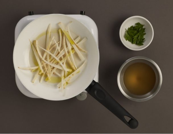 MoyenÉplucher et tailler les salsifis dans le sens de la longueur assez finement. Les faire revenir dans un peu d'huile d'olive pendant 5 minutes.