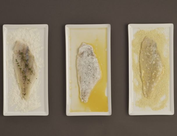 Assaisonner les filets de carrelet avec du sel, du poivre et du thym citron. Passer les filets dans la farine, puis dans les œufs entiers battus et la chapelure.