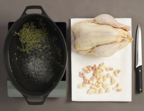 MoyenSortir la graisse de la volaille et la couper en petits dés. La réserver.
