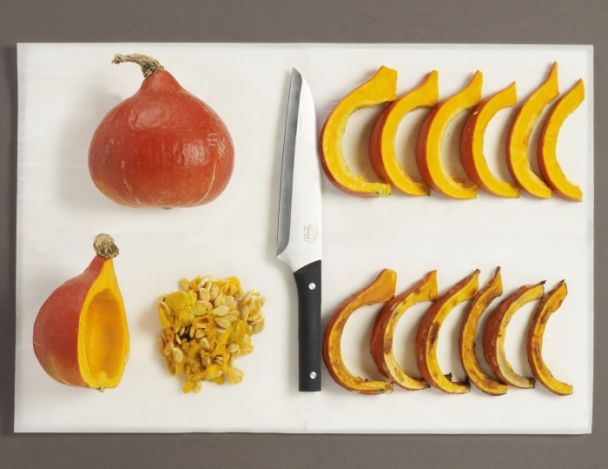 Dans l’intervalle, laver, couper le potimarron en 2, l’épépiner puis le recouper en 12 croissants égaux.
