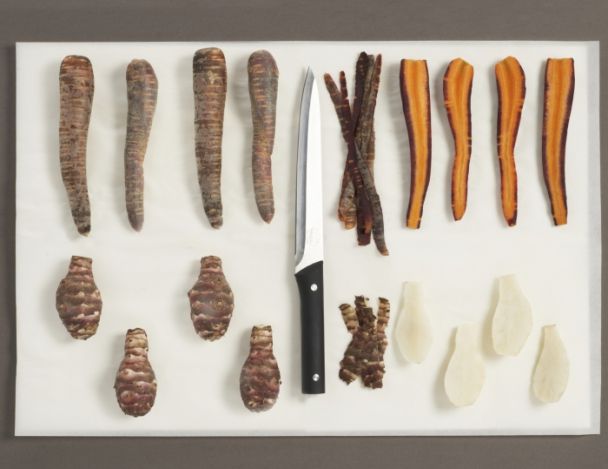 Eplucher les carottes et les cerfeuils tubéreux (ou les panais).