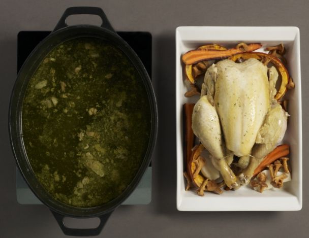 Plonger le chapon dans cette infusion et laisser pocher à très légère ébullition pendant 45 minutes.