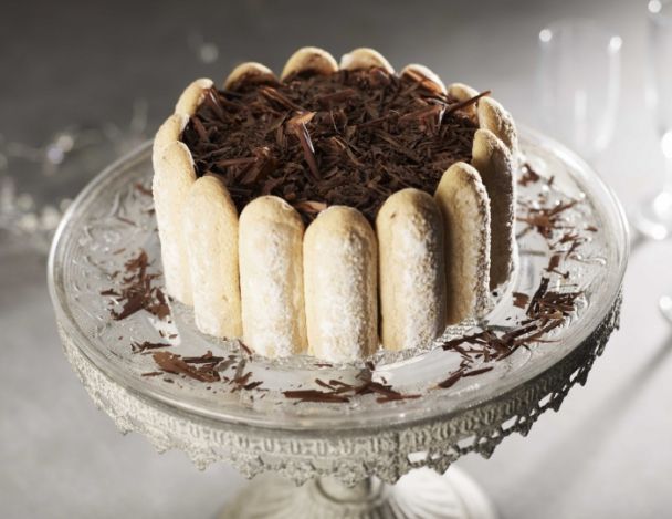 Décorer la surface avec des copeaux de chocolat noir. Ôter le cercle et servir immédiatement. Pour décorer la charlotte vous pouvez ajouter des paillettes d'or.