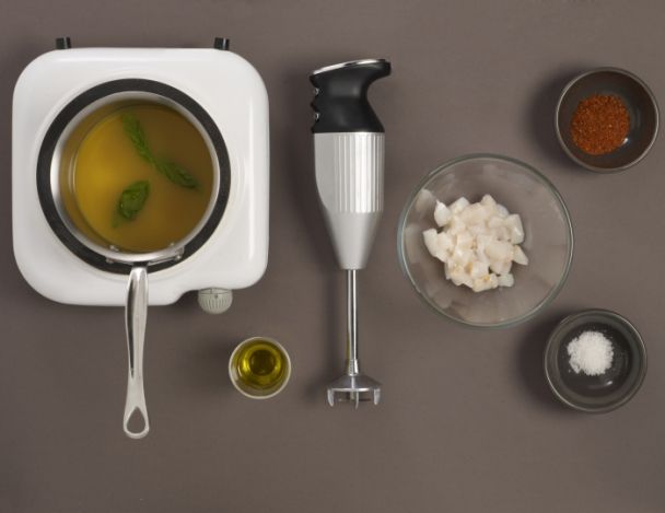 Récuperer le jus des deux oranges. Réduire le jus d’orange de moitié avec le basilic, émulsionner avec l’huile.