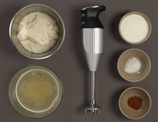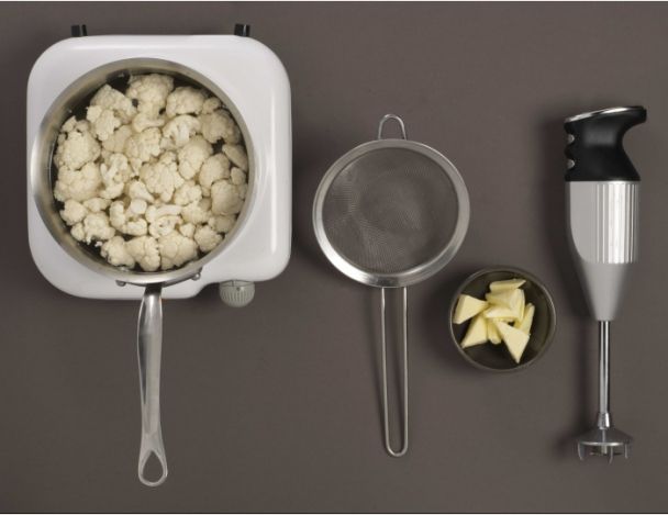 Prélever la moitié de la préparation de choux fleur. Détendre avec 50 cl de bouillon de volaille, émulsionner. Ajouter 50g de crème, saler, pimenter et mixer.