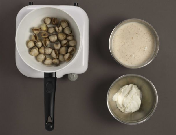 Fouetter les 200 gr de crème restante jusqu'à l'obtention d'une texture ferme. Mettre une quenelle de crème, étaler, poser une quenelle de Saint Jacques, disposer les coques autour et verser le velouté chaud.