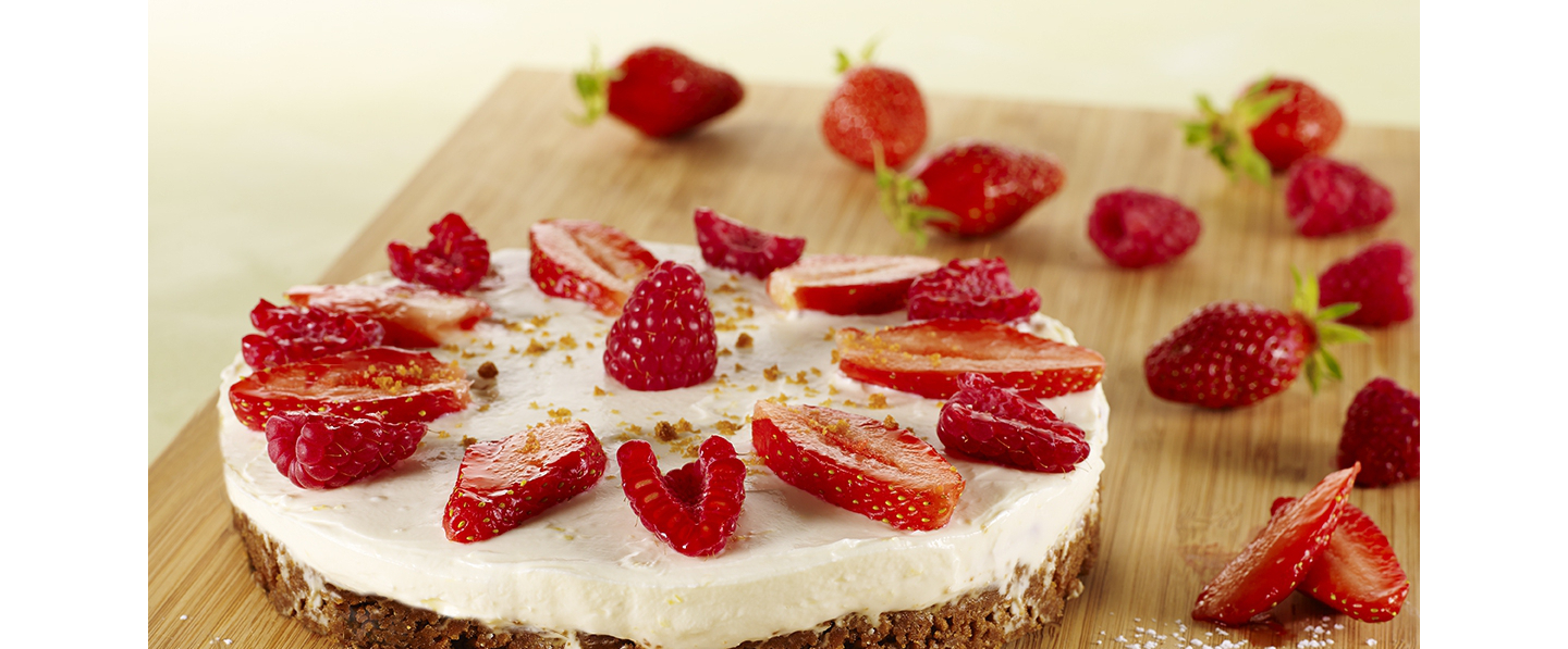 Décorer avec des fraises et des framboises, puis servir bien frais.