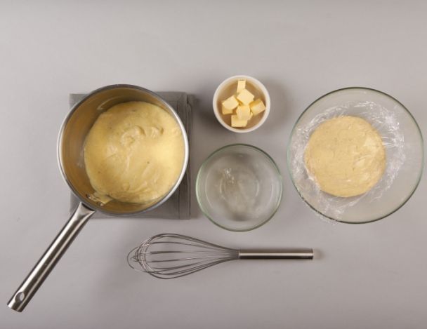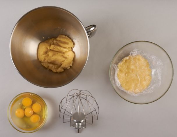 Mettre la panade dans la cuve du batteur et la faire tourner à vitesse moyenne pour la refroidir à l’aide du fouet. Dès qu’il n’y a plus de fumée qui s’en échappe, incorporer les œufs un par un.