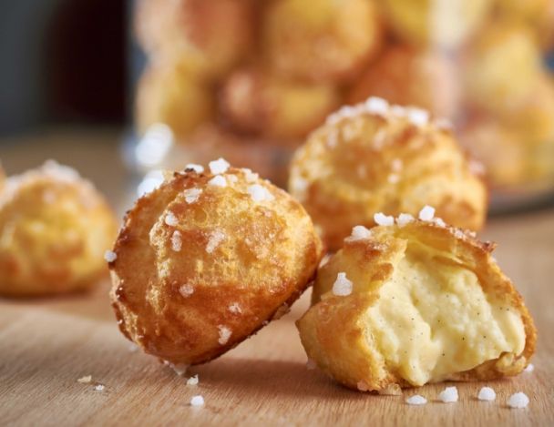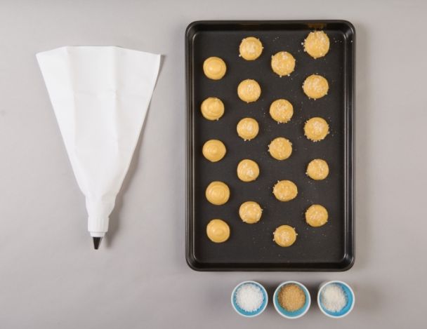 Sur une plaque de cuisson antiadhésive, former à l'aide d'une poche à douille unie (taille N°8) des choux d’environ 5 cm de diamètre en les espaçant de 2 cm. Parsemer à la surface des choux, une grosse quantité de sucre grain, jusqu’à les recouvrir complètement, puis pencher et tapoter la plaque pour enlever le surplus. Parsemer ensuite un peu de sucre roux et enfin quelques grains de fleur de sel.