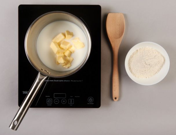 Dans une casserole, porter à ébullition l’eau, le lait, le beurre, la fleur de sel et le sucre.