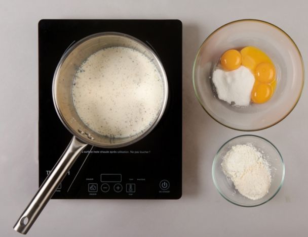 Dans une casserole, porter à ébullition le lait avec la vanille.