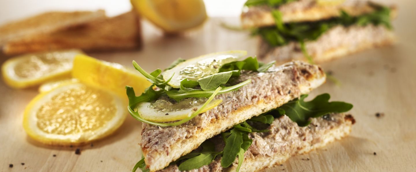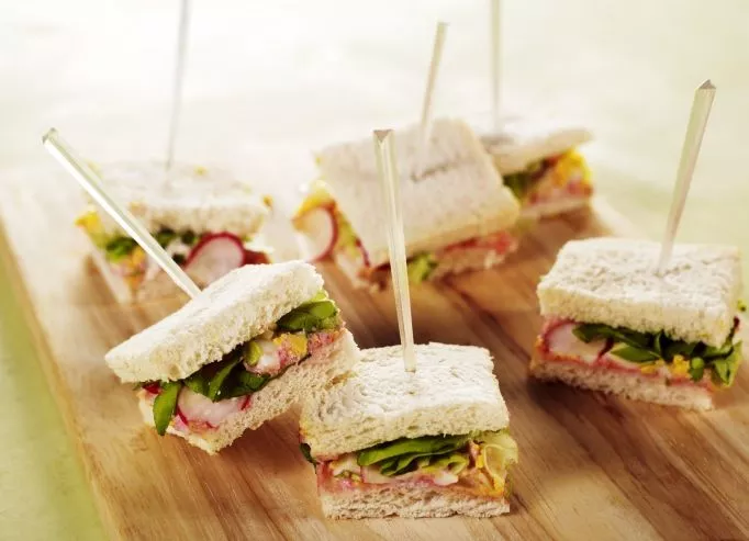 Couper les sandwichs en triangles et maintenir avec des piques. Garnir de fines rondelles de citron.