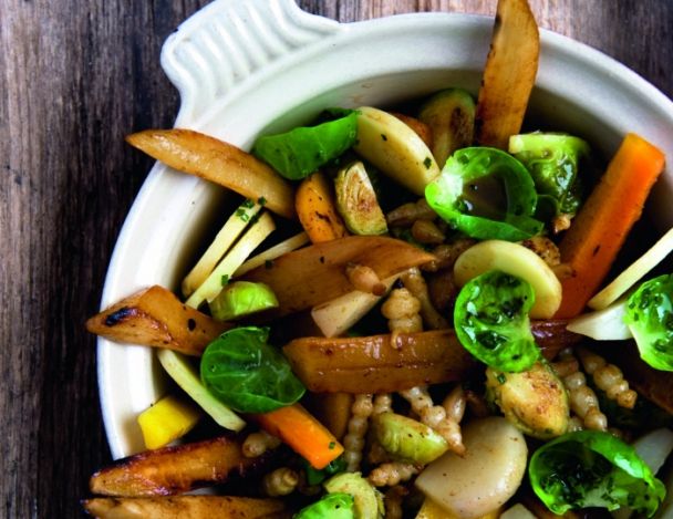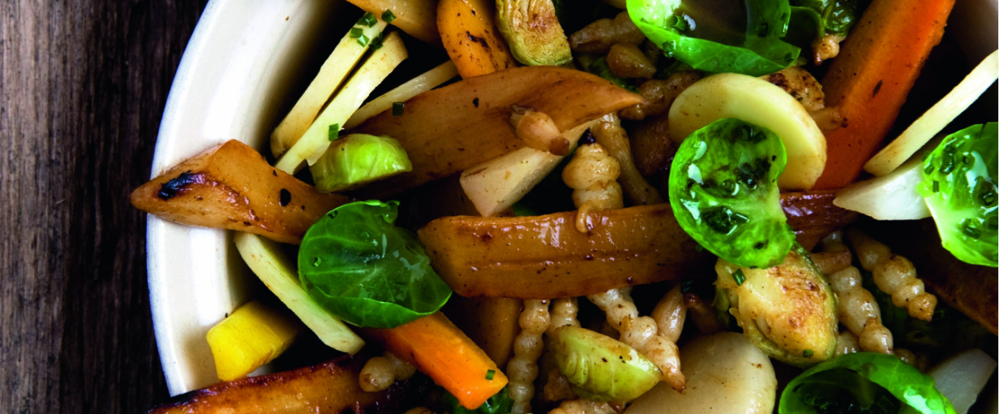 Dans un sautoir sur feu doux, faites fondre le beurre moussant. Déposez les choux de Bruxelles, faites-les revenir tout doucement, en leur donnant une légère coloration pendant 2 minutes. Ajoutez les crosnes, les carottes, les navets. Faites revenir très délicatement les légumes durant 3 à 4 min, puis versez le bouillon de volaille, laissez réduire ce dernier presque à sec.