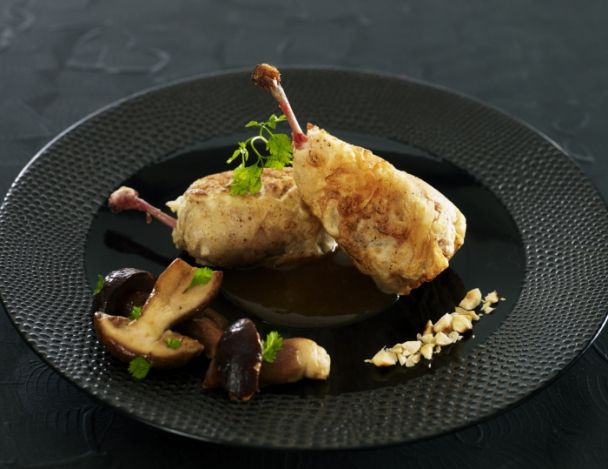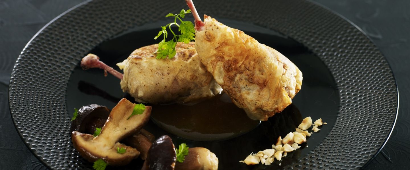 Disposer 2 côtelettes de cailles par personne sur une cuillère de jus brun. Accompagner avec une poêlée de cèpes.