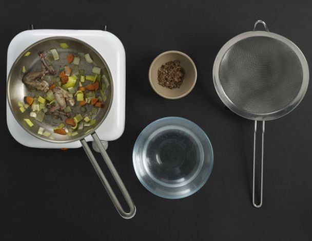 Faire dorer au beurre les ailerons et os des cuisses. Ajouter si l’on veut un peu de garniture aromatique (poireau, carotte, oignons…) ajouter le fond brun en poudre et recouvrir d’eau. Laisser cuire doucement durant 1 heure. Passer et réduire à liaison.