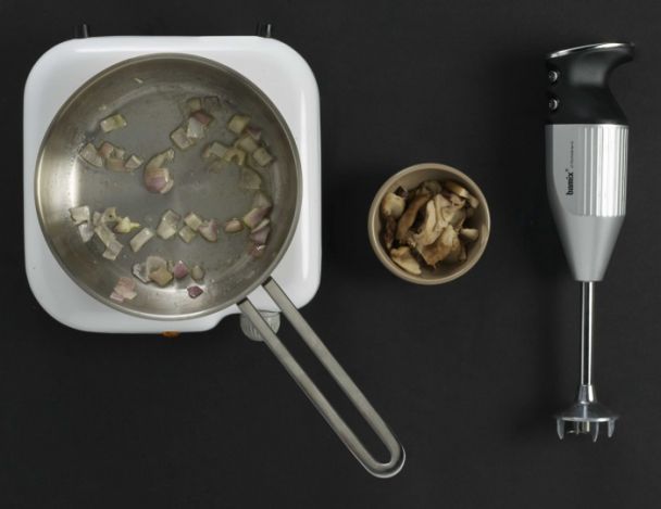 Nettoyer soigneusement les cèpes. Supprimer le dessous vert. Couper grossièrement. Couper l’échalote en gros morceaux et mettre en casserole avec le beurre. Ajouter les cèpes et laisser cuire jusqu'à évaporation de l’eau de végétation. Remuer constamment de façon à caraméliser l’ensemble. Débarrasser et mixer en purée. Rectifier l’assaisonnement puis refroidir.